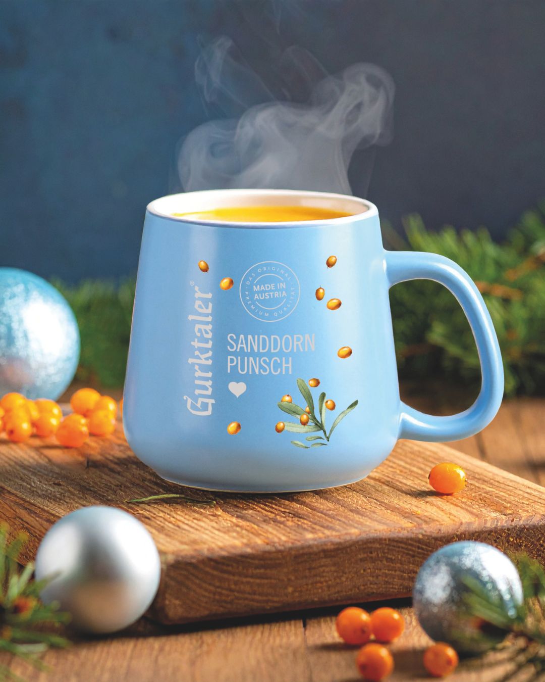 Dieses hochwertige Keramik-Häferl in einem sanften Blau ist der ideale Begleiter für gemütliche Punsch- und Teemomente. Auf der Vorderseite ist das Gurktaler Design mit dem Schriftzug „Sanddorn Punsch“ aufgebracht, ergänzt durch dekorative Sanddornbeeren und Blätter, die dem Häferl einen frischen, natürlichen Akzent verleihen.